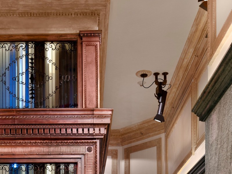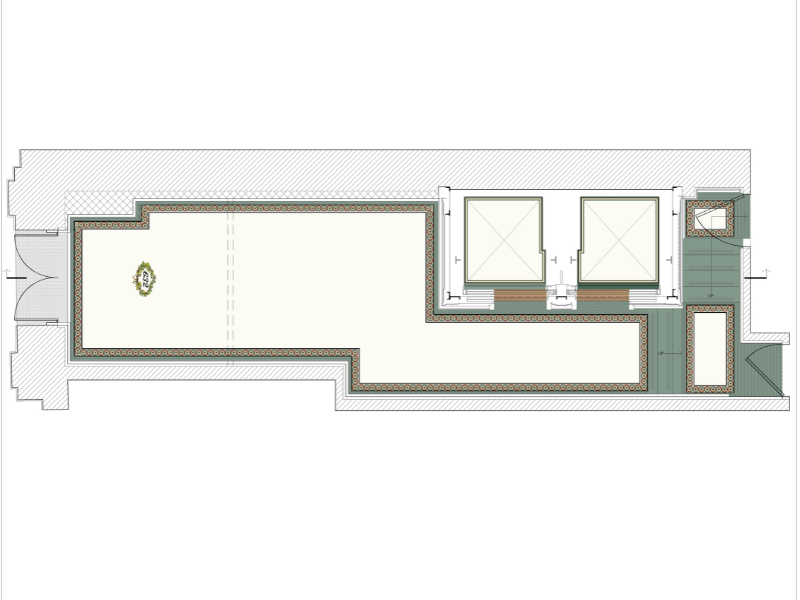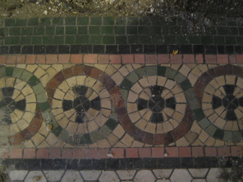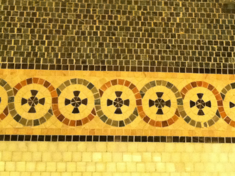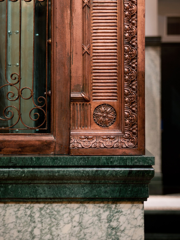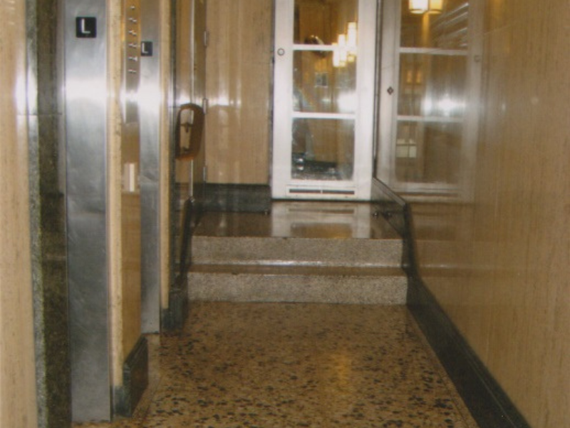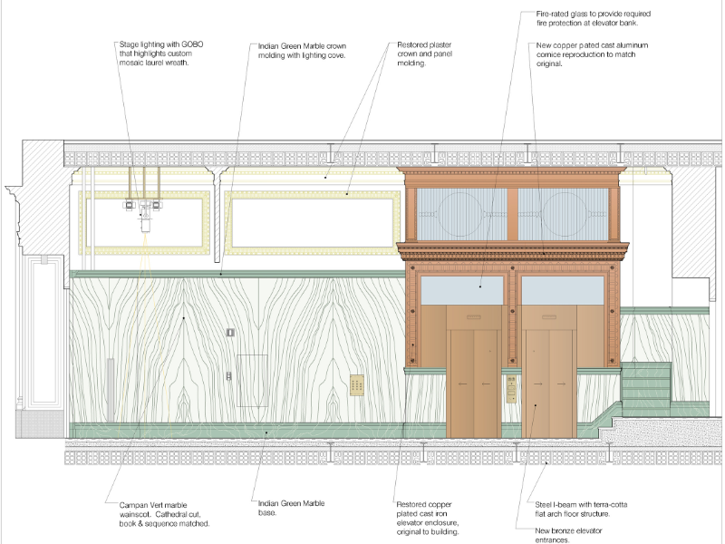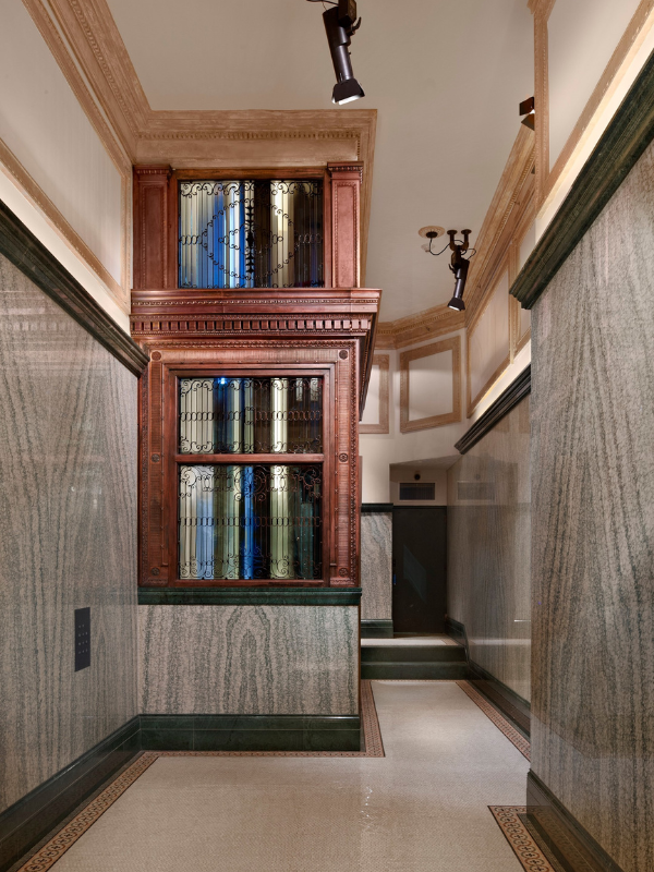 Recently, Mr. Ken Fishel, president of Renaissance Properties, began a building-wide upgrade in line with a more sophisticated tenant base, which originally included a modern “facelift for the lobby”. The original scope of work called for white marble wall panels (T.B.D.) and an upgrade of the terrazzo floor. Upon initial probes and demolition, mechanics discovered the original elaborate copper-plated cast iron elevator cage buried in the shaft walls a century ago. Along with the original elevator cage, three fragments of the original ceramic mosaic floor were uncovered in the corners beyond the modern terrazzo. A piece of original marble wainscot with crown and base was buried behind a mirrored panel. Knowing the importance of the finds, we along with the owner pursued the concept of restoring the lobby to the full grandeur of the original design. No longer would a simple “lobby facelift” suffice. Miller Druck, along with the owner and architect, began the arduous task of researching the details and materials originally implemented.