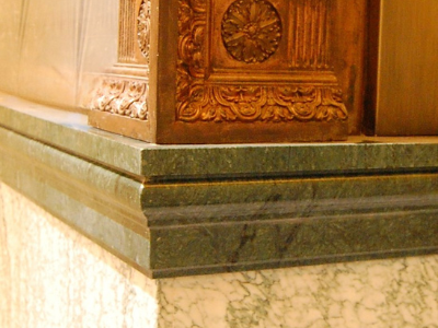 Recently, Mr. Ken Fishel, president of Renaissance Properties, began a building-wide upgrade in line with a more sophisticated tenant base, which originally included a modern “facelift for the lobby”. The original scope of work called for white marble wall panels (T.B.D.) and an upgrade of the terrazzo floor. Upon initial probes and demolition, mechanics discovered the original elaborate copper-plated cast iron elevator cage buried in the shaft walls a century ago. Along with the original elevator cage, three fragments of the original ceramic mosaic floor were uncovered in the corners beyond the modern terrazzo. A piece of original marble wainscot with crown and base was buried behind a mirrored panel. Knowing the importance of the finds, we along with the owner pursued the concept of restoring the lobby to the full grandeur of the original design. No longer would a simple “lobby facelift” suffice. Miller Druck, along with the owner and architect, began the arduous task of researching the details and materials originally implemented.